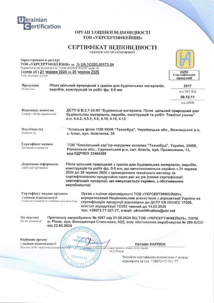 Conformity certificate DSTU Б В. 2.7-32-95_sand_Klesiv quarry