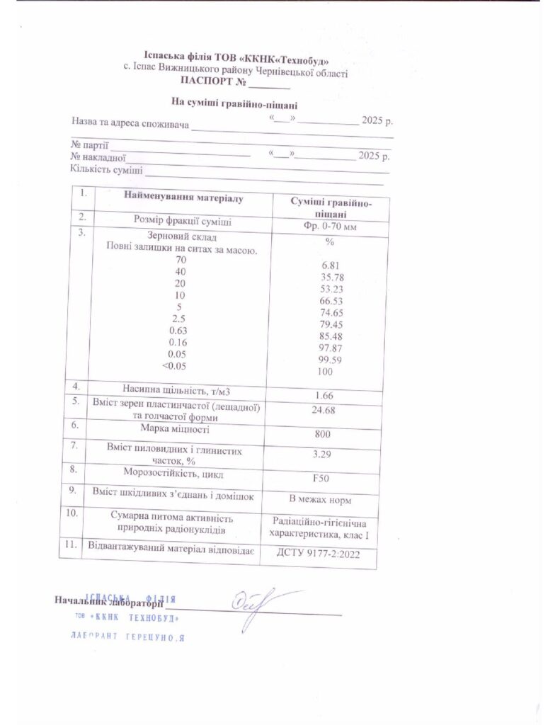 - ПГС - фракції 0-70 мм відповідно до ДСТУ Б В.2.7-30:2013.