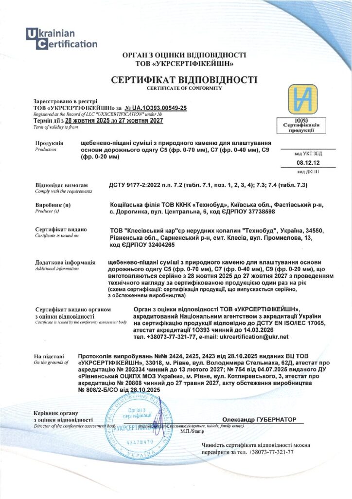 | Сертифікація / стандарти | ДСТУ 9177-2:2022EN 13242:2013 (ЩПС 0–31,5 мм) | ДСТУ Б В.2.7-30:2013 |